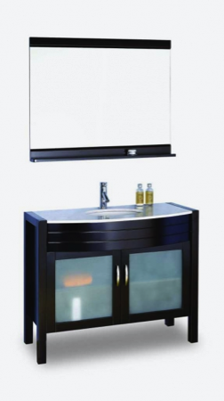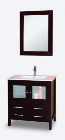 Description: A modern style vanity with framed mirror, ceramic counter top, ceramic basin, aluminum legs and wood cabinets. A sleek design to fit any modern bathroom style.