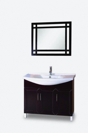 Description: A modern style vanity with framed mirror, marble counter top, ceramic basin, stainless steel legs and wood cabinets. A sleek design to fit any modern bathroom style.