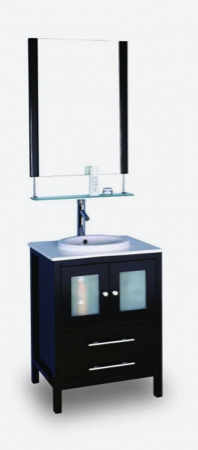 Description: A modern style vanity with framed mirror, mirror shelf, ceramic counter top, ceramic basin/bedplate and wood cabinets. A sleek design to fit any modern bathroom style.